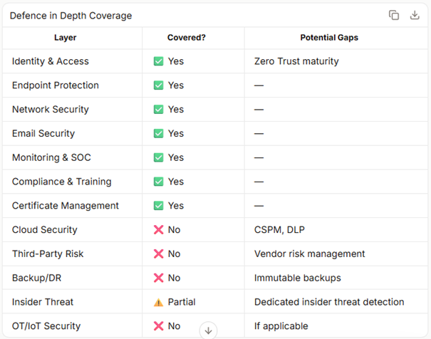 “Your proposed Defence in Depth (DiD) solution set is comprehensive and covers multiple layers of security—from identity and access management to endpoint protection, network security, and monitoring. Below is a structured analysis of its effectiveness and potential gaps: